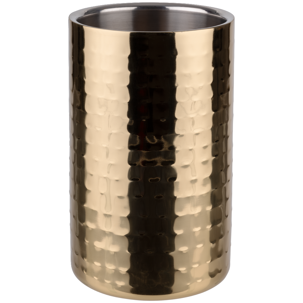Edelstahl, aussen Goldoptik, gehämmerte Oberfläche, doppelwandig für beste Isolierung. Geeignet für 0,7 bis 1,5 Liter-Flaschen