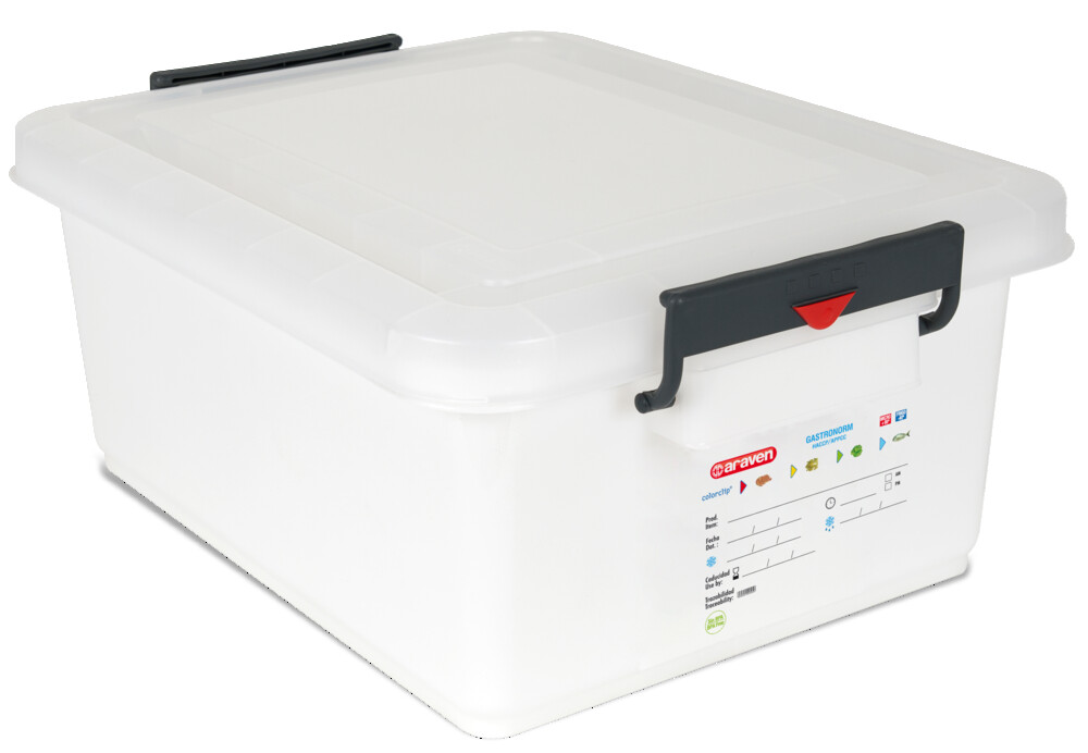 Behälter mit Deckel zum Transport von Lebensmitteln. Integrierte permanente Etikette, ColorClip um Verwechslungen der verschiedenen Nahrungsmittel zu vermeiden, leer oder mit Deckel stapelbar, seitliche Griffe mit Klammer für einfache Handhabung und Transport