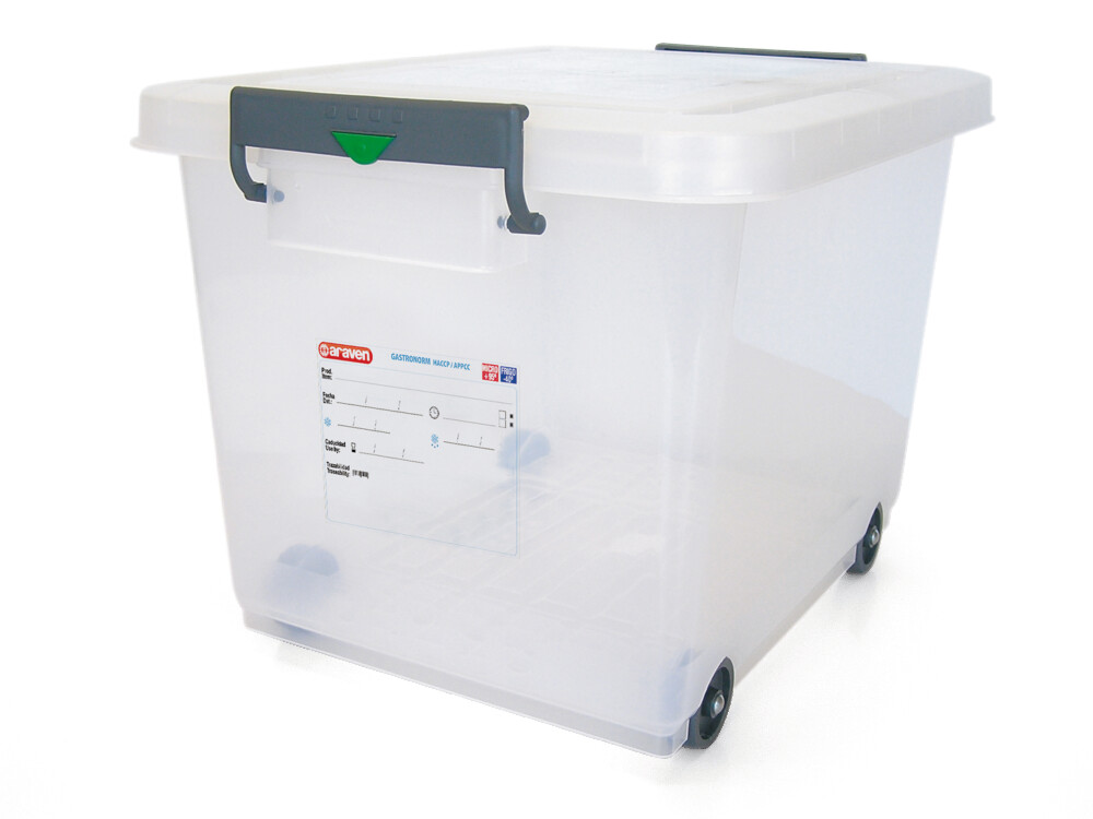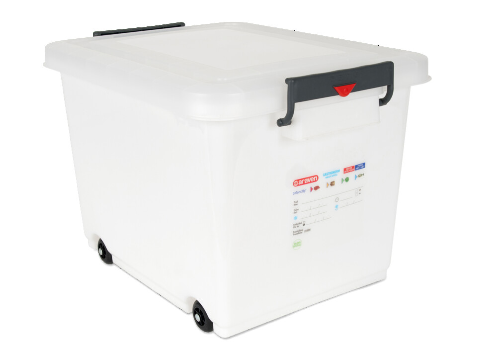Behälter mit Deckel zum Transport von Lebensmitteln. Integrierte permanente Etikette, ColorClip um Verwechslungen der verschiedenen Nahrungsmittel zu vermeiden, leer oder mit Deckel stapelbar, seitliche Griffe mit Klammer für einfache Handhabung und Transport
