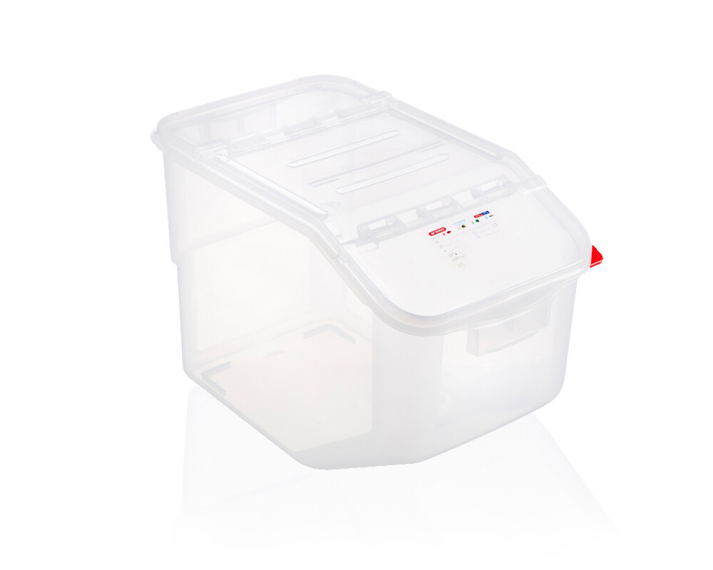 Zutatenbehälter zur Aufbewahrung trockener Lebensmitteln. Die Behälter sind mit dem FIFOSystem (first in-first out) ausgestattet. So haben diese hinten einen Deckel zum Befüllen und vorne eine Deckel zum Entnehmen von Lebensmitteln.