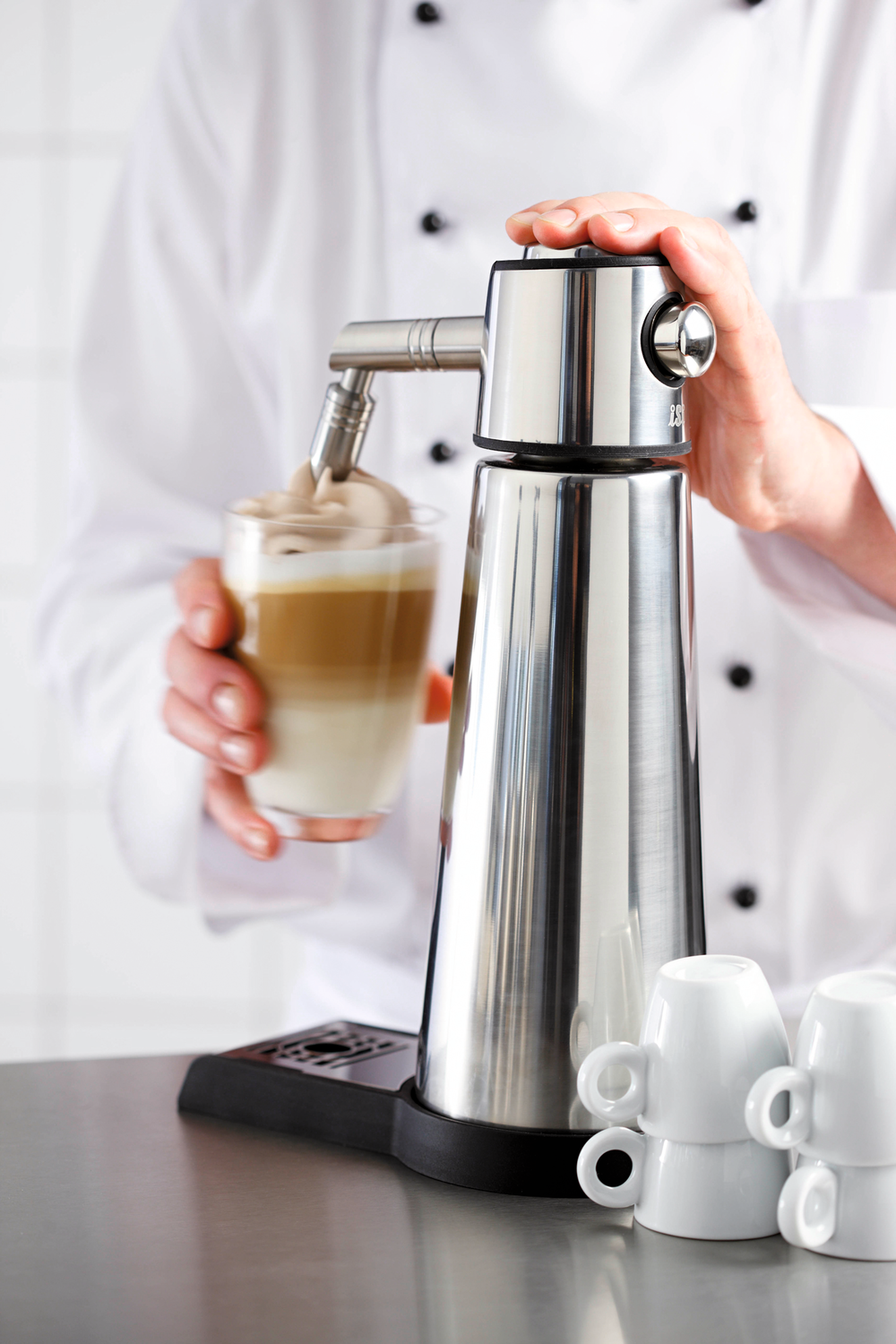Inox, Standgerät mit Thermo-Effekt, innovatives Steigrohrsystem, doppelwandige vakumisolierte Flasche mit maximaler Thermoleistung, mit rutschfestem Untersetzer mit Integrierter Tropfschale, Inox-Garniertülle