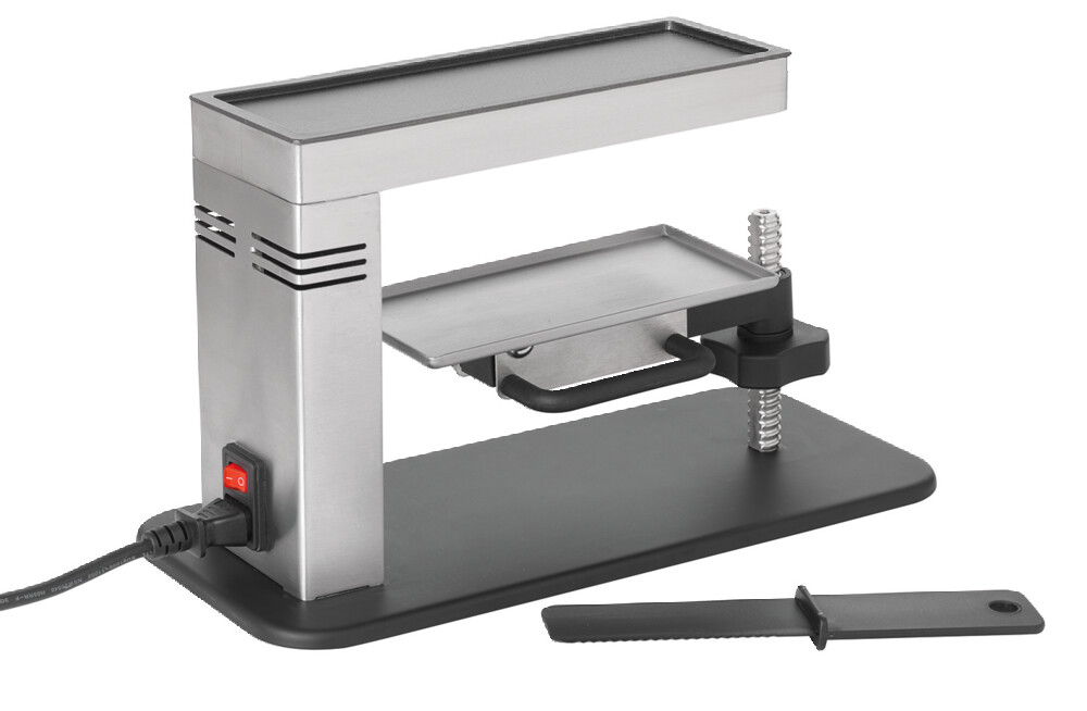 Das traditionelle Schweizer Raclette zum Abstreichen des Raclettekäses von handelsüblichen Käseblöcken. Käsehalter aus Edelstahl, höhenverstellbar, kipp- und schwenkbar, spülmaschinentauglich, mit Grillplatte aus Aluguss antihaftversiegelt