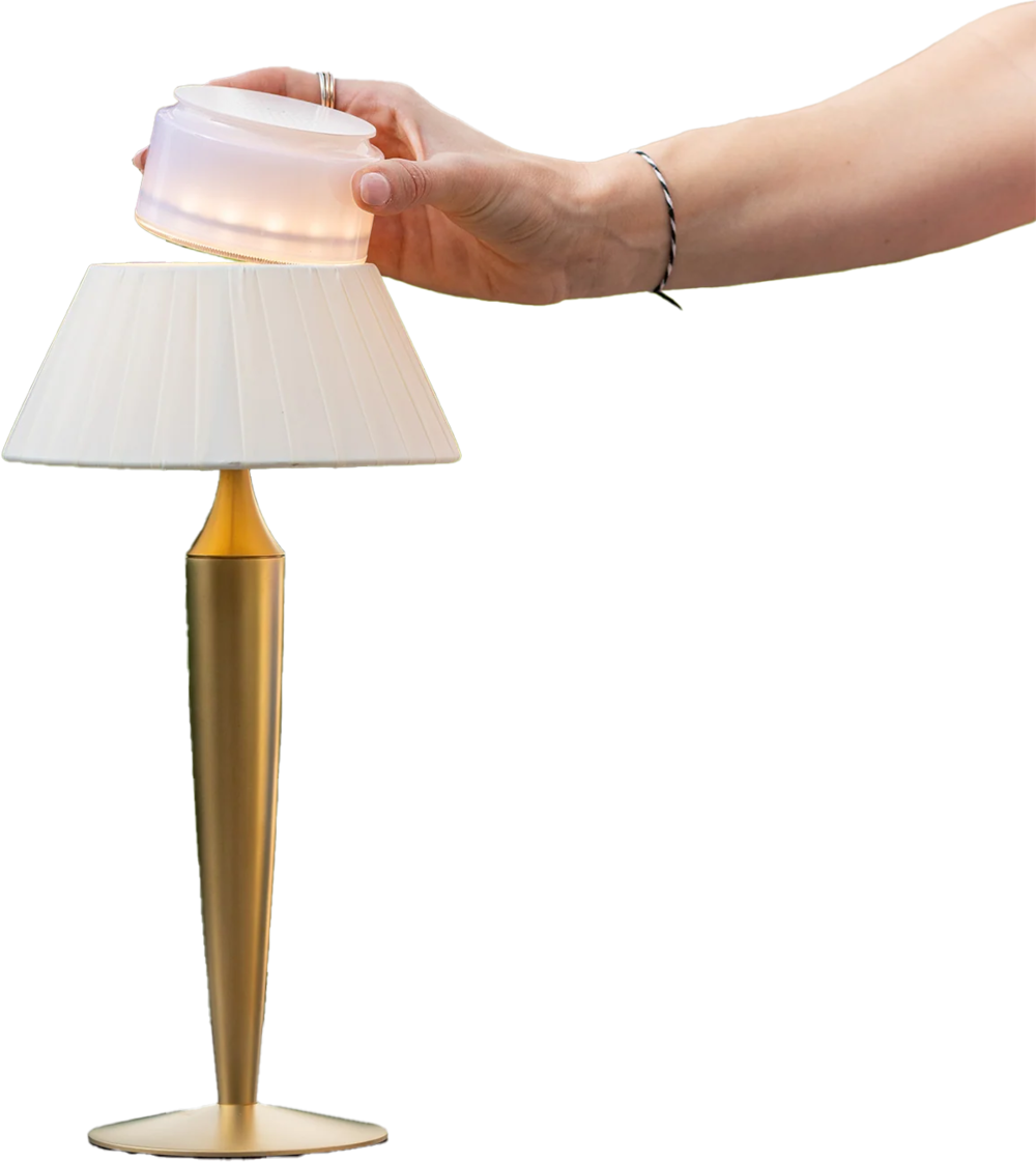 Akkubetriebene, tragbare und wideraufladbare LED-Tischleuchte mit einem Lampenschirm aus plissiertem Stoff. Das LED-Modul ist mit einere Magnetbefestigung ausgestattet und lässt sich leicht abnehmen, entfernen und auf der mitgeleiferten Kontaktladestation aufladen, was den Vorgang schnell und mühelos macht.