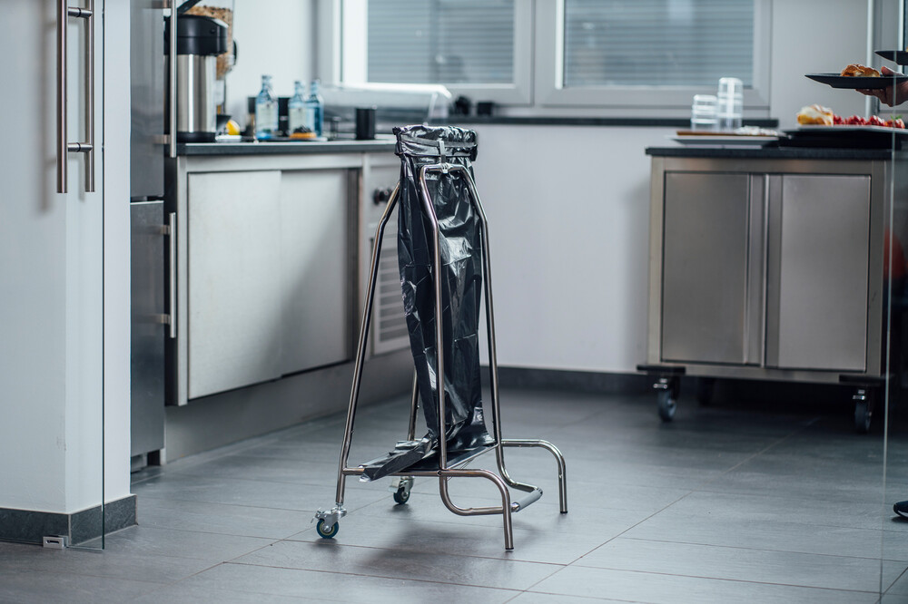 Mittige Öffnung per Fusspedal, Müheloses Einlegen und Entfernen der Müllsäcke, geeignet für Müllbeutel bis 120 ltr., 110 x 70 cm