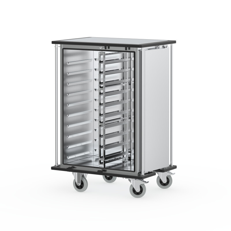 Chariot de transport robuste en acier inoxydable, isolé par une double paroi, pour une utilisation quotidienne. Les surfaces intérieures et extérieures lisses permettent un nettoyage hygiénique. Des pare-chocs en plastique protègent contre les dommages. Des roulettes de qualité et quatre barres de poussée assurent une manipulation facile. Des portes et une isolation bien étanches