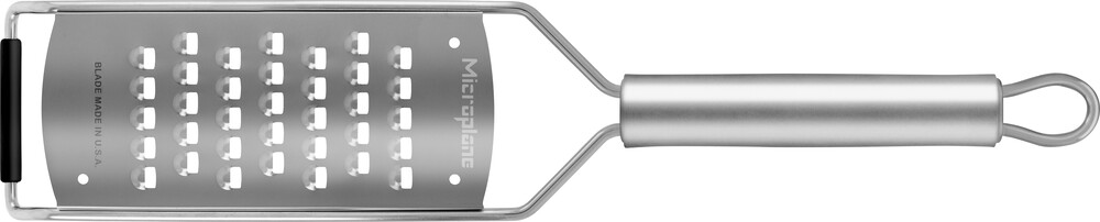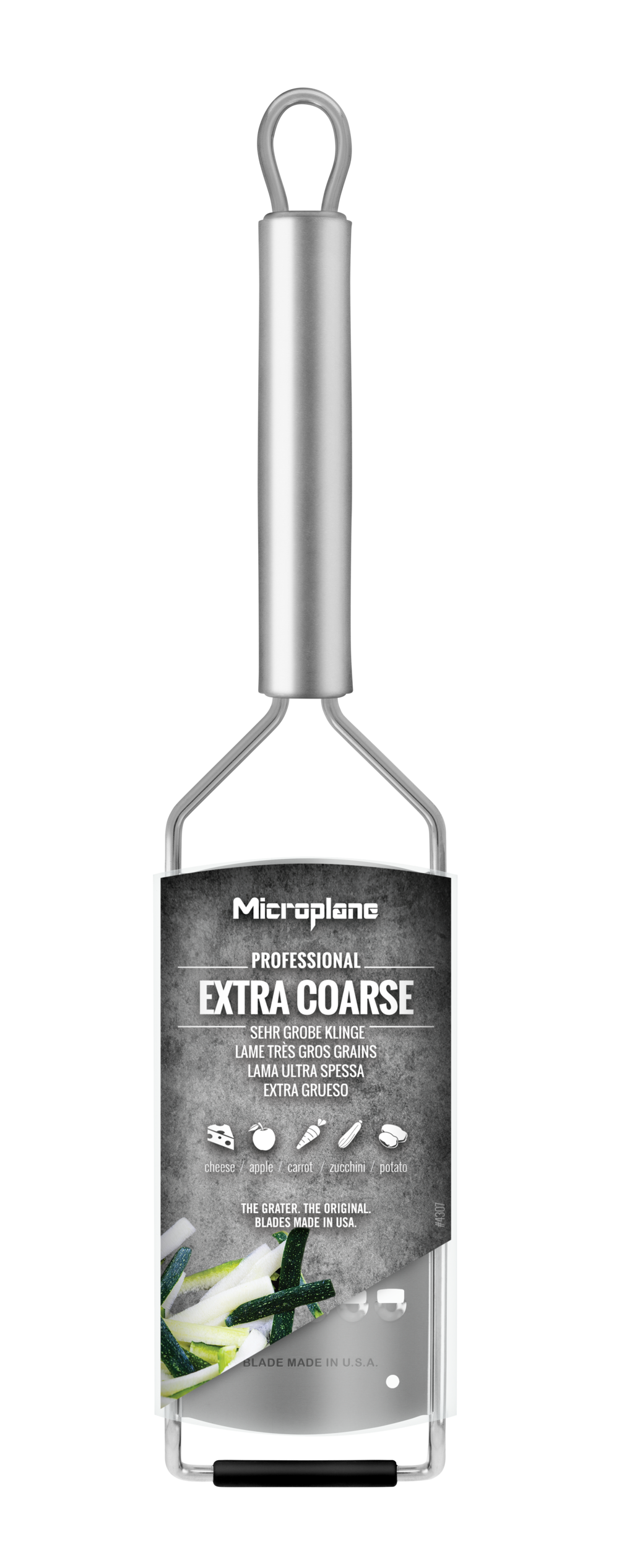 Le design de la lame très gros grains permet, avec sa large surface de coupe, de râper efficacement, sans effort et avec une grande précision. Pommes de terre, pommes, choux, carottes, courgettes, concombres, potirons, fromages à pâte dure et molle, etc. sont découpés en lanières longues et bien lisses.